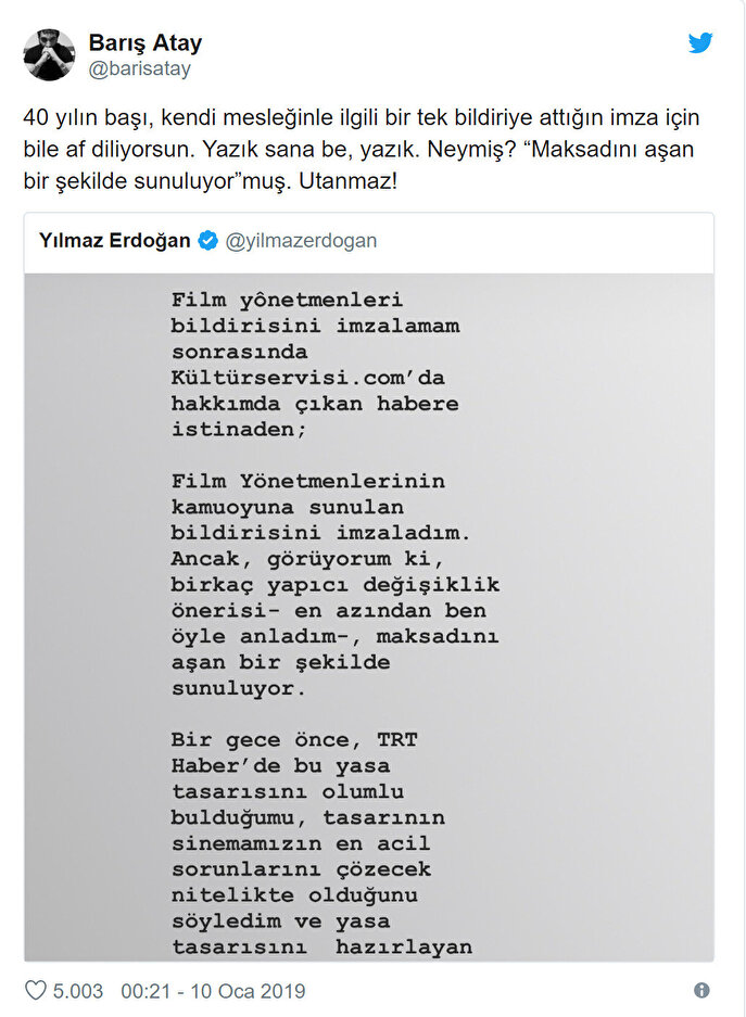 Barış Atay, kabul edilen sinema teklifiyle ilgili yönetmenlerin talep ettiği değişiklikler sosyal medyada olumsuz bir şekilde yansıtılınca Yılmaz Erdoğan "Birkaç yapıcı değişiklik önerisi maksadını aşan bir şekilde sunuluyor" diye açıklama yaptı. Erdoğan, olayı terörize etmeyince Barış Atay, Twitter hesabından çirkin sözler sarf etti. Atay, "40 yılın başı mesleğinle ilgili bir tek bildiriye attığın imza için bile af diliyorsun. Yazık sana be, yazık" dedi.