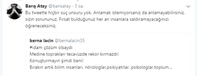 Berna Laçin'in tweetinde suç unsuru bulunmadığını iddia eden Barış Atay, bir de tehditkâr sözler sarf etti.