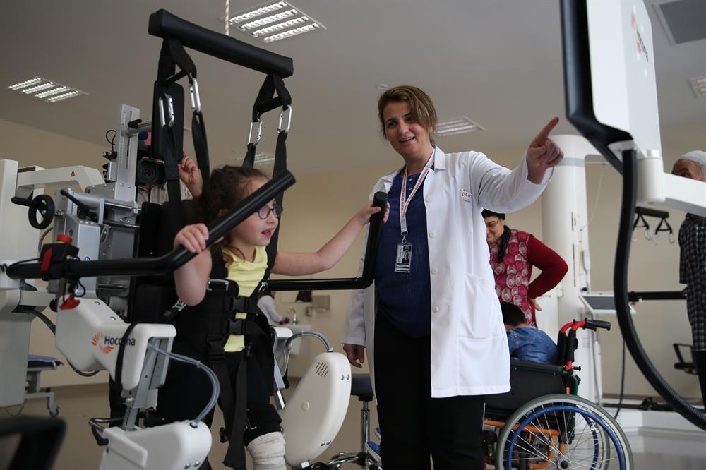 Hastanede, fizik tedaviye ihtiyacı olan çocuk hastalara, robotik rehabilitasyon yürüme cihazı ile yürüme becerisi kazandırılmaya çalışılıyor. Çocuklar robotla egzersiz yaparken bir yandan da ekrana yansıtılan oyunlarla adımlarını sıklaştırmaya çalışıyor. Uygun görülen hastalar robotik rehabilitasyon yürüme cihazının yanı sıra hidroterapi havuzlarından da yararlanarak tedavi görüyor.