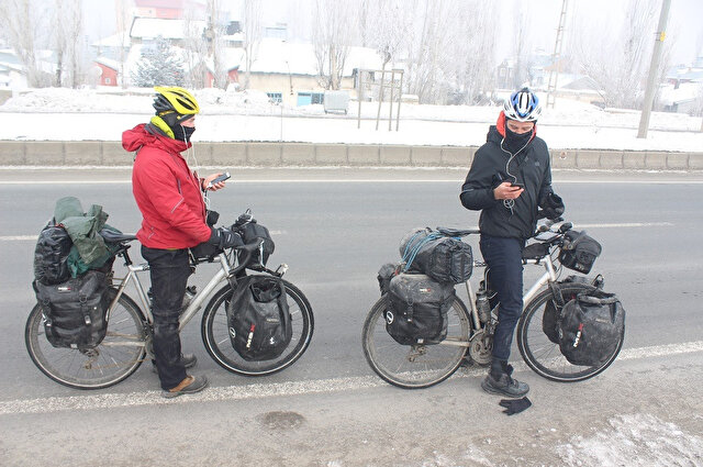Bisikletleriyle şehri dolaşan gezginler, sıfırın altında 20 dereceye kadar düşen soğuk havada donan teller, buz tutan yollar, çatılardan sarkan ve 2 metreyi bulan buz sarkıtları karşısında şaşkınlıklarını gizleyemedi.