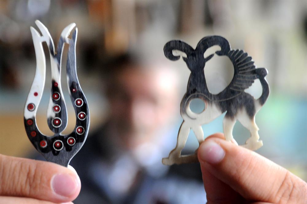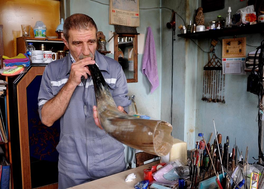 Geleneksel Türk süsleme ve el sanatları ustası 64 yaşındaki Mehmet Atışan, sığır ve manda boynuzlarını değerli taşlarla işleyerek takıya dönüştürüyor.