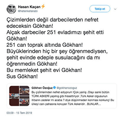 Çizimlerden değil darbecilerden nefret edeceksin Gökhan! Alçak darbeciler 251 evladımızı şehit etti Gökhan! 251 can toprak altında Gökhan! Büyüklerinden hiç bir şey öğrenmediysen, şehit evinde edeple susulacağını da mı öğrenmedin Gökhan! Bu memleket şehit evi Gökhan! Sus Gökhan!