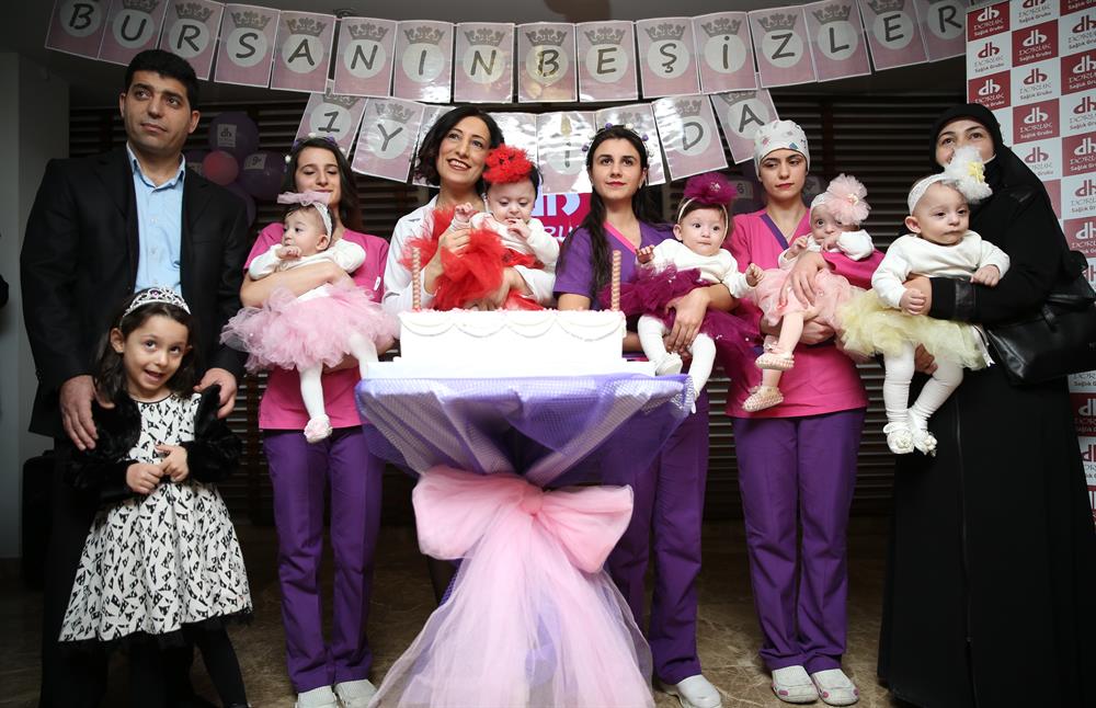 Hatice ve Fatih Yılmaz çiftinin, geçen yıl Bursa'da dünyaya gelen beşizleri 1 yaşını doldurdu. Sağlıkla bir yaşına giren bebekler için aile hastanede doktorlar ile birlikte kutlama yaptı. Bebeklerden birine Cumhurbaşkanı Recep Tayyip Erdoğan'ın merhum annesi Tenzile adı verilirken diğer kızlara da Hira Nur, Havva, Rabia ve Berfin adları konuldu.