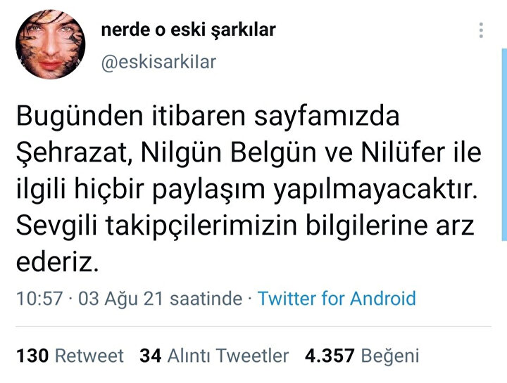 Şehrazat’a destek, oyuncu Nilgün Belgün’den geldi. Belgün, “Benim de ağrıma gitti ben de paylaşmayacağım” diye yazdı.