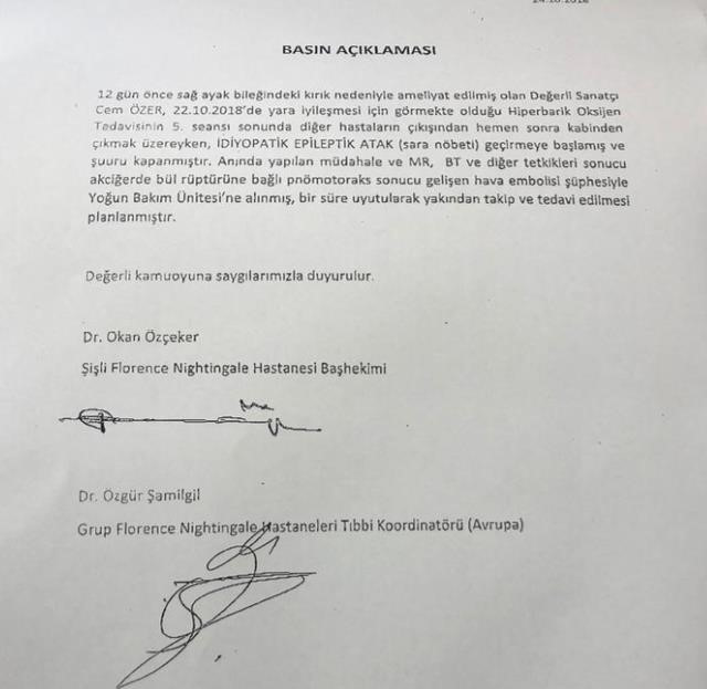 - "12 gün önce sağ ayak bileğindeki kırık nedeniyle ameliyat edilmiş olan değerli sanatçı Cem Özer, 22.10.2018'de yara iyileşmesi için görmekte olduğu hiperbarik oksijen Tedavisinin 5. seansi sonunda diğer hastaların çıkışından hemen sonra kabinden çıkmak üzereyken, idıyopatık epileptik atak (sara nöbeti) geçirmeye başlamış ve şuuru kapanmıştır. Anında yapılan müdahale ve MR, BT ve diger tetkikleri sonucu akciğerde bu rüptürüne bağlı pnömotoraks sonucu gelişen hava embolisi şüphesiyle Yoğun Bakım Ünitesi'ne alınmış, bir süre uyutularak yakından takip ve tedavi edilmesi planlanmıştır."