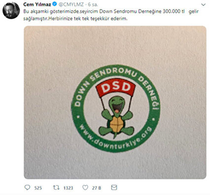 Cem Yılmaz, son gösterisinden elde edilen 300 bin TL'lik geliri Down Sendromu Derneği'ne bağışladı. Twitter hesabı üzerinden paylaşım yapan Cem Yılmaz, şu paylaşımı yaptı: