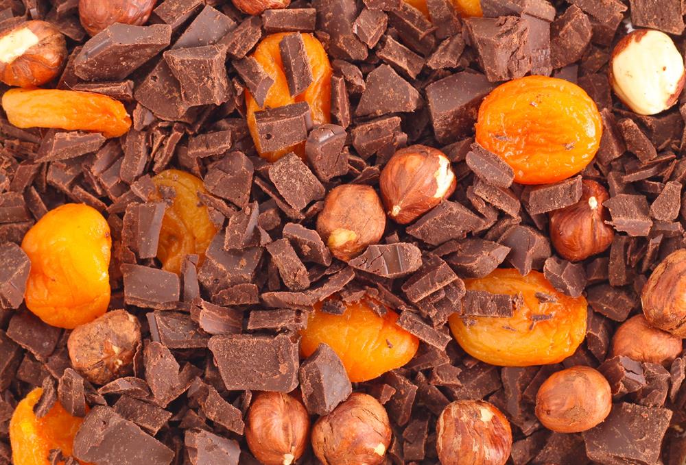 MALZEMELER: 250 g kakao yağı 4 yemek kaşığı tereyağ 1 su bardağı kakao 1 su bardağı ezilmiş fındık 100 gram kuru kayısı