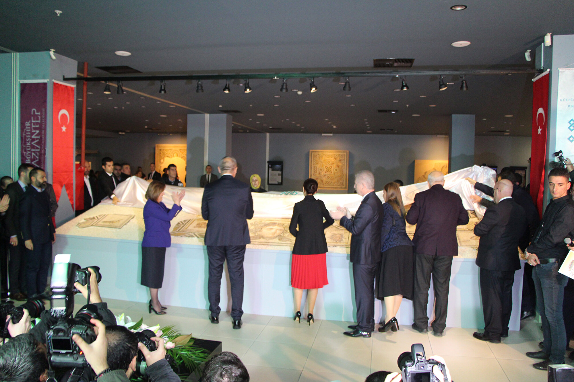 Konuşmaların ardından mozaiklerin üzerindeki örtü Bakan Ersoy, milletvekilleri ve diğer protokol üyeleri tarafından kaldırılarak sergilenmek üzere açıldı.