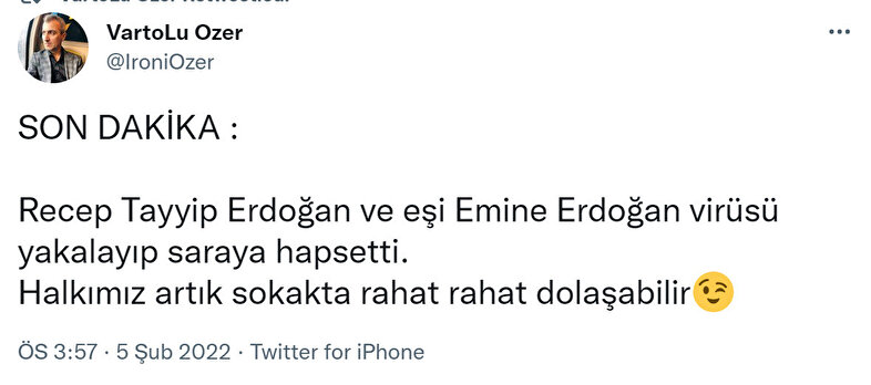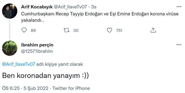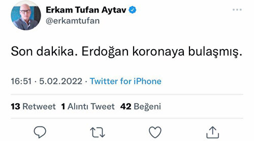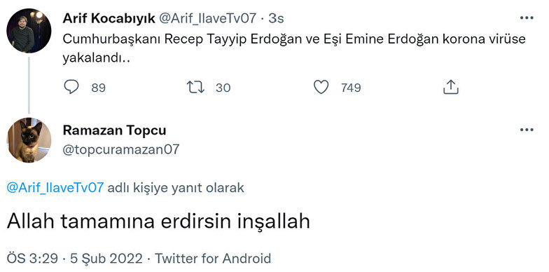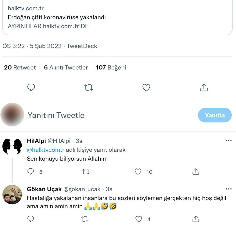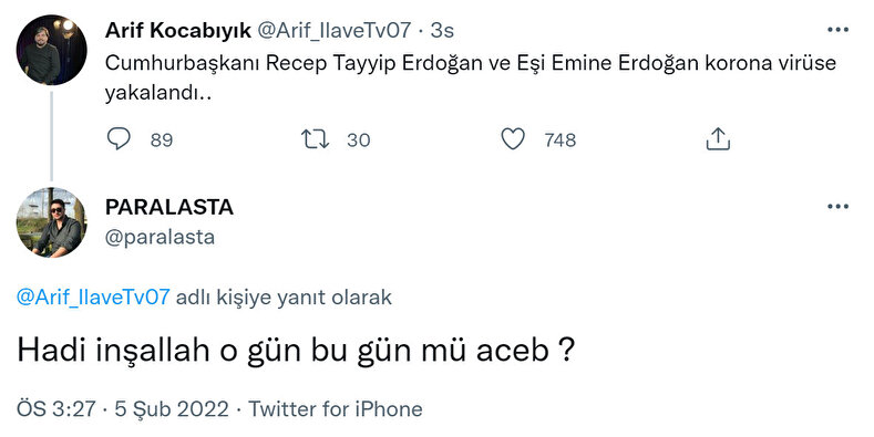 Cumhurbaşkanı Recep Tayyip Erdoğan eşi Emine Erdoğan ile birlikte koronavirüs testinin pozitif çıktığını duyurdu. Cumhurbaşkanı Erdoğan, sosyal medya hesabından yaptığı açıklamada "Omicron varyantı olduğunu öğrendiğimiz hastalığı hamdolsun hafif geçiriyoruz" ifadelerini kullandı. Erdoğan'ın paylaşımın altına yapılan çirkin yorumlar 'yok artık' dedirtti.