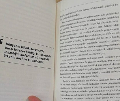"Daha iyi işleyen bir uluslararası düzen kurmak için ihtiyacımız olan halihazırdaki uluslararası kurumları çok taraflılık ekseninde yeniden yapılandırmaktır. Etkin çok taraflılık ancak kapsayıcı olan çok taraflı kurumların varlığıyla mümkün olabilir. Bu anlamda güvenlik konseyinin yeniden yapılandırılmasından başlayıp kapsamlı ve anlamlı reformları süratle uygulamaya koymalıyız. Güvenlik Konseyi’ni daha etkin, demokratik, şeffaf hesap verebilir bir yapıya ve işleyişe kavuşturmalıyız.