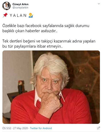 Ünlü isimler için zaman zaman kime ait olduğu bilinmeyen sosyal medya sayfalarında yapan öldü haberleri, Yeşilçam efsane oyuncusu Cüneyt Arkın'ı sinirlendirdi. Özellikle Facebook sayfalarında sağlık durumu ile ilgili yapılan bu tarz paylaşımaların asılsız olduğunu belirten Arkıni " Tek dertleri beğeni ve takipçi kazanmak adına yapılan bu tür paylaşımlara itibar etmeyin" dedi.