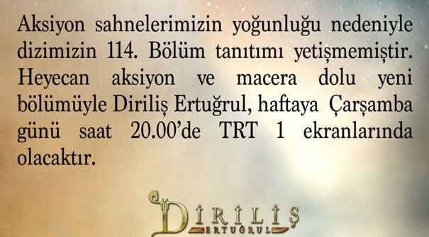 "Aksiyon sahnelerimizin yoğunluğu nedeniyle dizimizin 114. bölümünün tanıtımı yetişmemiştir. Heyecan aksiyon ve macera dolu yeni bölümüylr Diriliş Ertuğrul, haftaya yeni bölümüyle Çarşamba günü saat 20.00'de TRT 1 ekranlarında olacaktır."