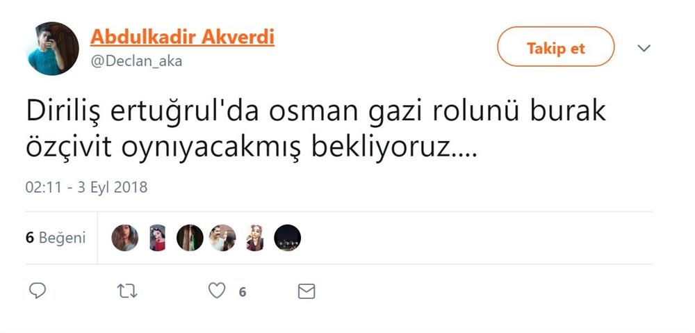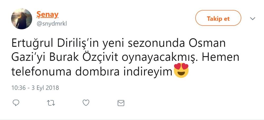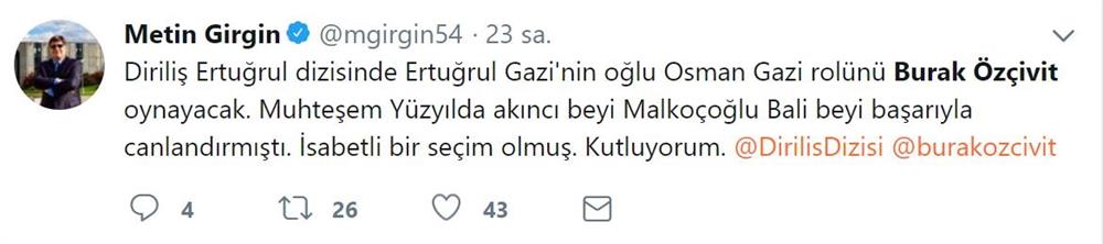 TRT 1'in reyting rekortmeni dizisi Diriliş Ertuğrul'da Osman Gazi rolünü kimin oynayacağı merak konusuydu. Ünlü oyuncu Burak Özçivit'in Diriliş Ertuğrul'un yeni sezonunda, Ertuğrul Bey'in oğlu Osman Bey'i canlandıracağı öğrenildi. Burak Özçivit'in "Osman Gazi" rolüne çok yakışacağını düşünen Diriliş hayranları, binlerce yorum yaptı.