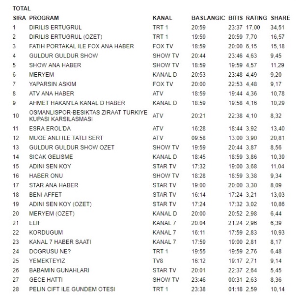 Çarşamba günü reyting birinciliğini elden bırakmayan Diriliş Ertuğrul, bu haftada birinci oldu. Diriliş'e rakip olarak başlayan Star TV'nin yeni dizisi Babamın Günahları ise 26. sırada yer bulabildi.