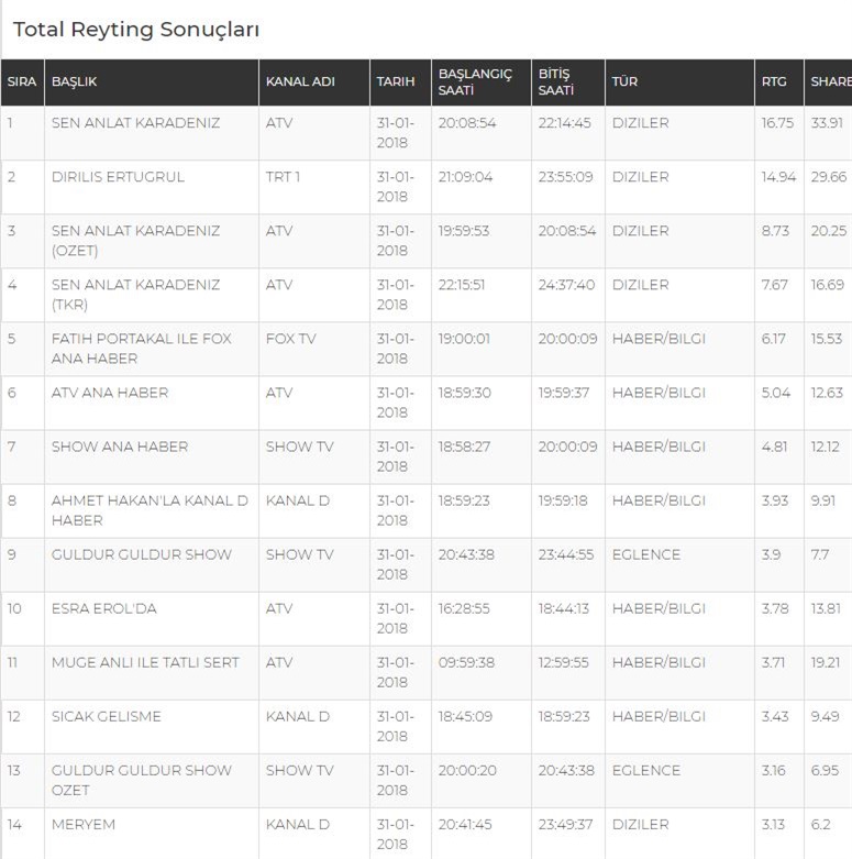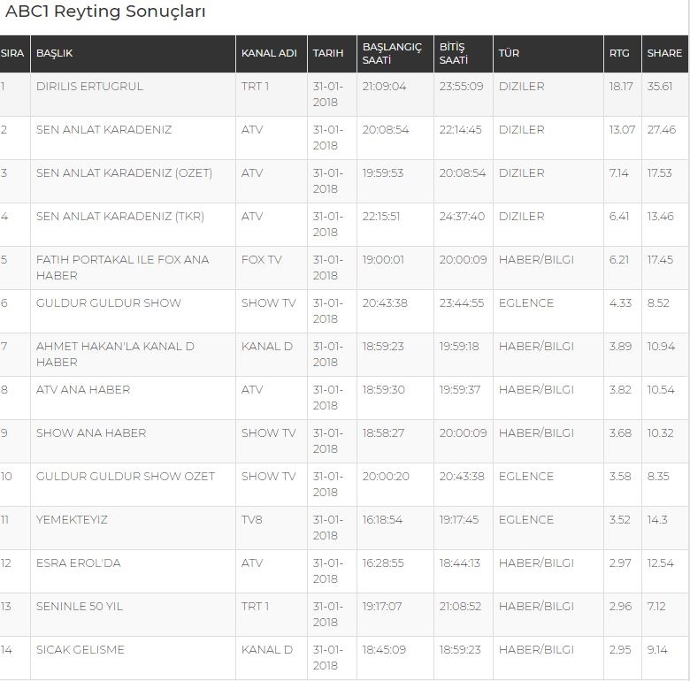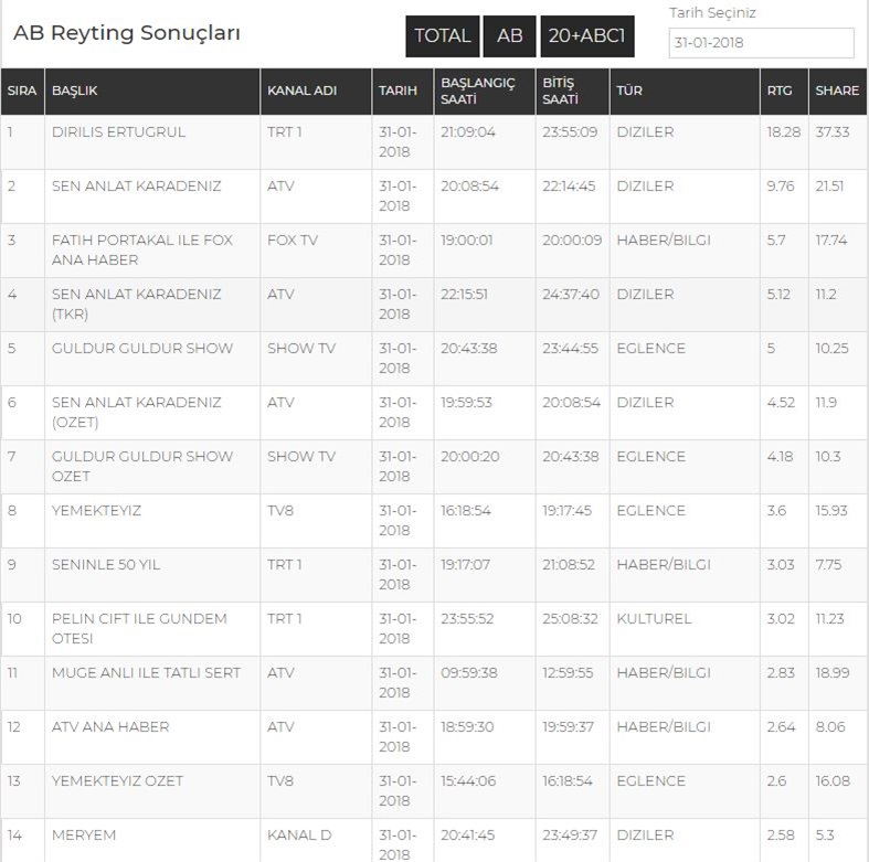 TRT 1'in fenomen dizisi Diriliş Ertuğrul, dört sezondur ilk defa reytinglerde birinci olamadı. Total reyting grubuna göre Diriliş Ertuğrul yüzde 29 izlenme oranıyla ikinci sıraya yerleşti. Atv'nin Sen Anlat Karadeniz dizisi 2. bölümü ise Total'de birinci oldu. AB ve ABC grubunda Diriliş Ertuğrul birinci sırada yer aldı. İşte 31 Ocak reyting sonuçları...
