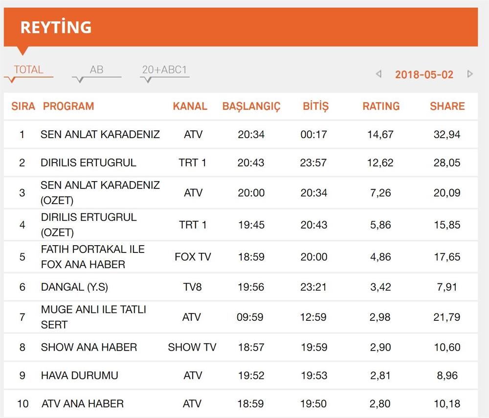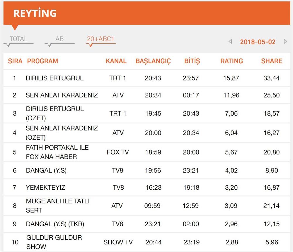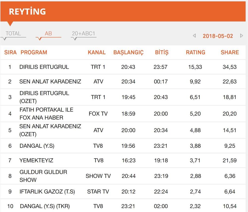 TRT 1'in fenomen dizisi Diriliş Ertuğrul, 2 Nisan Çarşamba günü yayınlanan 116. bölümünde 2. sırada yer alırken Sen Anlat Karadeniz ilk sırada yer aldı. Dört sezondur birinciliği kaptırmayan TRT'nin sevilen dizisi Diriliş Ertuğrul AB ve ABC grubunda birinci sırada yer aldı. İşte 2 Mayıs reyting sonuçları...