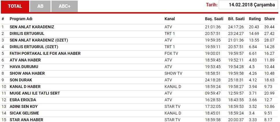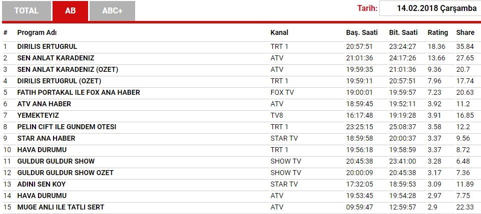 TRT 1'in fenomen dizisi Diriliş Ertuğrul, dört sezon boyunca birinciliği kimseye kaptırmazken, Sen Anlat Karadeniz ile sarsıldı. Total reyting grubuna göre Diriliş Ertuğrul yüzde 27 izlenme oranıyla ikinci sıraya yerleşti. Atv'nin Sen Anlat Karadeniz dizisi ise Total'de yüzde 39 izlenme oranıyla birinci oldu. AB ve ABC grubunda Diriliş Ertuğrul birinci sırada yer alırken, dört sezondur özetiyle ikinci sırayı da dolduran Diriliş Ertuğrul'un özeti Sen Anlat Karadeniz'in altında yer aldı. İşte 14 Şubat reyting sonuçları...