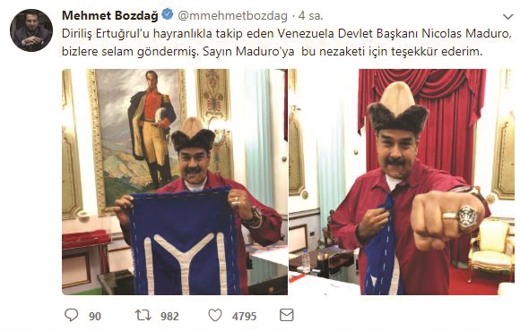 Beğeniyle izlenen ve dünyanın dörtbir yanında hayranları olan Diriliş Ertuğrul dizisinin bir hayranı da Venezuela Devlet Başkanı Nicolas Maduro çıktı. Maduro börk takıp, Kayı boyu bayrağıyla fotoğraf çektirdi ve dizinin yapımcılarına selam gönderdi.