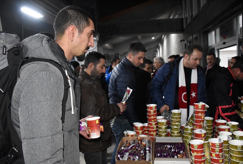 Kars Tren Garı'nda bekleyen vatandaşlar da yolcuları karanfillerle karşılayarak, Sarıkamış Belediyesince hazırlanan sıcak çorba ve helva ikramında bulundu.