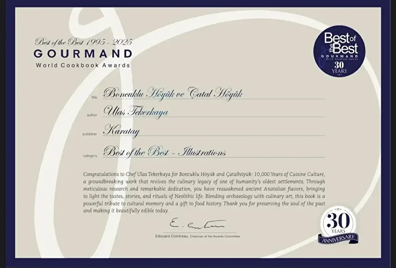 Karatay Yayınları tarafından Türkiye’de yayımlanan Ulaş Tekerkaya imzalı Boncuklu Höyük ve Çatalhöyük: 10 bin Yıllık Mutfak Kültürü adlı eser, Gourmand Awards tarafından Dünyanın En İyi İllüstrasyon Kitabı ve Dünyanın En İyi Gastronomi Tarihi Kitabı ödüllerine layık görüldü. Böylece kitap, son 30 yılın en başarılı çalışmaları arasında gösterildi.