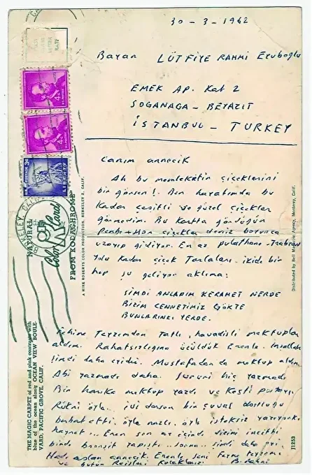 Müzayededeki nadide eserlerden ressam ve şair Bedri Rahmi Eyüboğlu’ndan Monterey ABD’den annesi Lütfiye Rahmi’ye gönderdiği şiirli posta kartı son derece samimi bir hava taşıyor. Bedri Rahmi 30 Mart 1962 tarihli “Canım Annecik” hitabıyla başlayan kartta şu satırları yazıyor: “Ah bu memleketin çiçeklerini bir görsen! Ben hayatımda bu kadar çeşitli ve güzel çiçekler görmedim. Bu kartta gördüğün pembe mor çiçekler deniz boyunca uzayıp gidiyor. En az Pulathane Trabzon yolu kadar çiçek tarlaları. İki de bir hep şu geliyor aklıma: Şimdi Anladım Keramet Nerde/Bizim Cennetimiz Gökte/Bunlarınki Yerde”