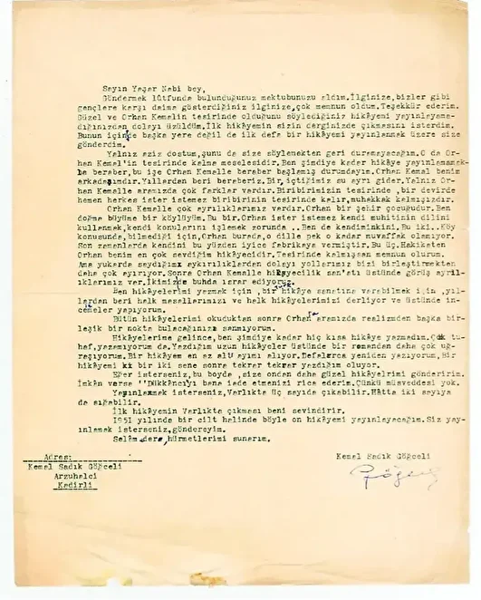 Müzayededeki mektuplardan Yaşar Kemal’in “Kemal Sadık Göğceli” müstearıyla Yaşar Nabi Nayır’a Kadirli’den yazdığı 1951 yılına ait mektubu dikkate değer. “İlk hikâyemin Varlık’ta çıkması beni sevindirir” diyen Yaşar Kemal mektubunda Nayır’a gönderdiği hikâyenin yayınlanmamasına sitem ettiği ve Orhan Kemal’in tesiri konusuna cevap verdiği şu satırlar yer alıyor: “Yalnız aziz dostum, şunu da size söylemekten geri durmayacağım. O da Orhan Kemal’in tesirinde kalma meselesidir, ben şimdiye kader hikâye yayınlamamakla beraber, bu işe Orhan Kemalle beraber başlamış durumdayım, Orhan Kemal benim arkadaşımdır. Yıllardan beri beraberiz. Bir, içtiğiniz su ayrı gider. Yalnız Orhan Kemal’le aramızda çok farklar vardır. Birbirinizin tesirinde bir devirde hemen herkes ister istemez birbirinin tesirinde kalır, muhakkak kalmışızdır. Orhan Kemal’le çok ayrılıklarımız vardır. Orhan bir şehir çocuğudur, ben doğma büyüme bir köylüyüm. Bu bir. Orhan ister istemez kendi muhitinin dilini kullanmak, kendi konularını işlemek zorunda… Ben de kendiminkini. Bu iki… Köy konusunda, bilmediği için, Orhan burada, o dile pek o kadar muvaffak olamıyor. Son zamanlarda kendini bu yüzden iyice fabrikaya vermiştir. Bu üç. Hakikaten Orhan benim en çok sevdiğim hikâyecidir. Tesirinde kalmışsam memnun olurum. Ama yukarıda saydığım aykırılıklardan dolayı yollarımız bizi birleştirmekten daha çok ayırıyor, Sonra Orhan Kemal’le hikâyecilik sanatı üstünde görüş ayrılıklarımız var. İkimiz de bunda ısrar ediyoruz. Bütün hikâyelerimi okuduktan sonra Orhan’la aramızda realizmden başka birleşik nokta bulacağınızı sanmıyorum.”