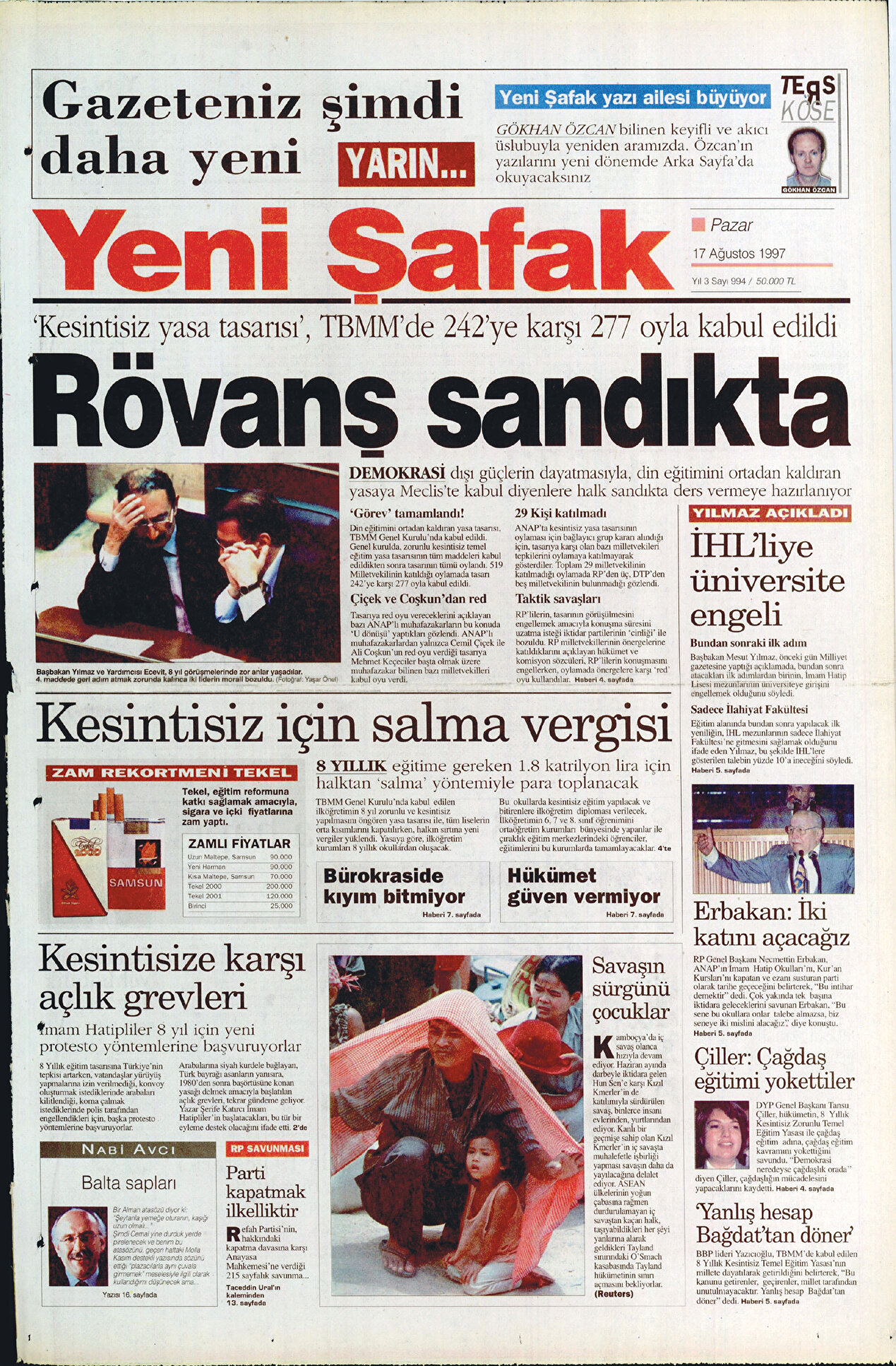 - Meclis’te oylaman önce toplum milletvekillerine son çağrıda bulunmak için meydanlarda seslerini dile getirdi. Vatandaş, “İmam-hatip okullarının orta kısımlarını kapatmayı amaçlayan bu tasarıya oy vermeyin, yoksa halk sizi affetmez” mesajları verdi. Kesintisiz yasa tasarı 16 Ağustos 1997’de TBMM’de 242’ye karşı 277 oyla kabul edilerek tarihe kara leke olarak düştü. Yeni Şafak 17 Ağustos 1997’de ‘Rövanş Sandıkta’ manşeti attı.