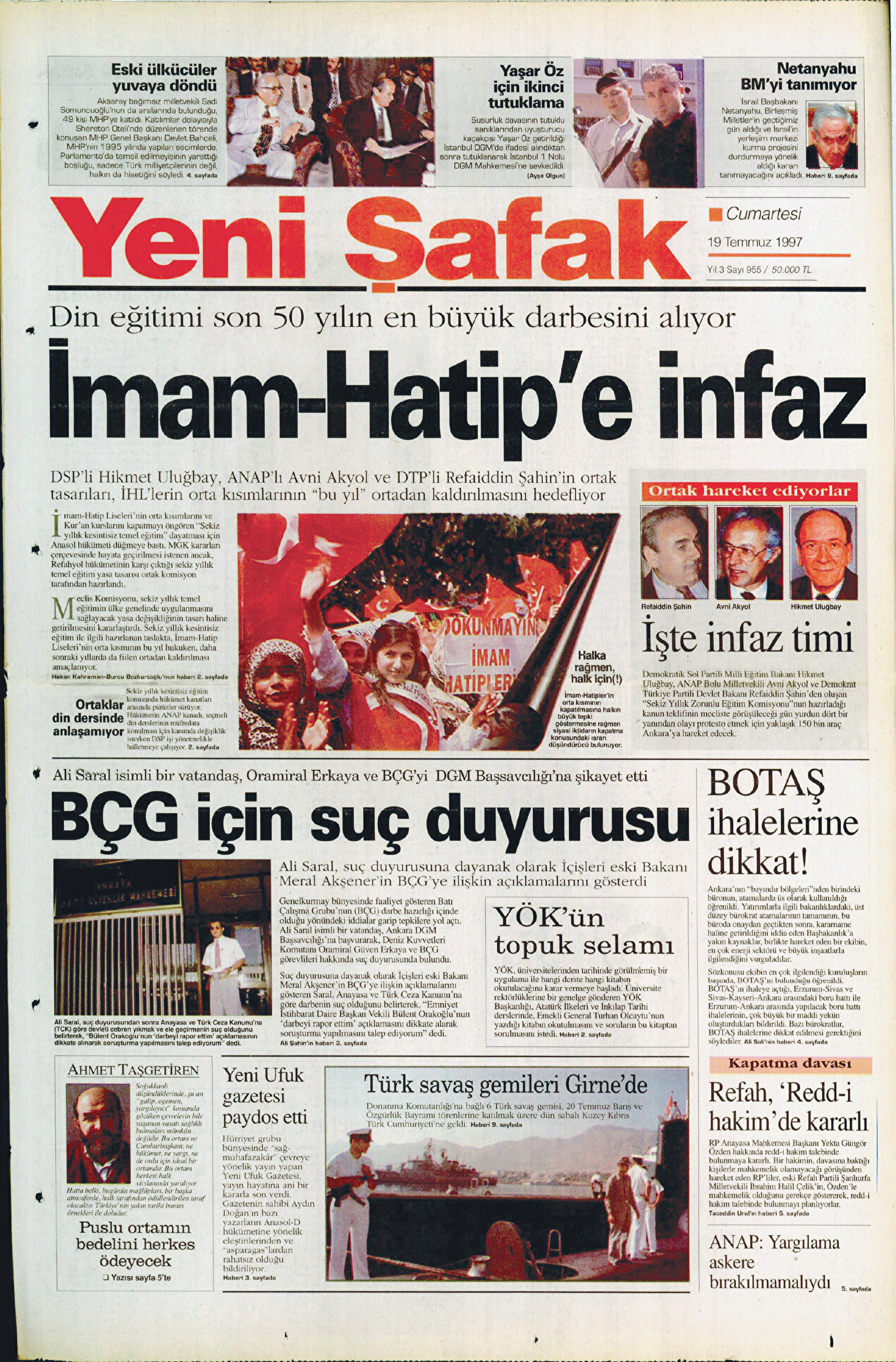 - 8 yıl kesintisiz eğitim düzenlemesi dönemin MGK Genel Sekreteri Orgeneral İlhan Kılıç’ın Başbakanlığı ziyaret etmesi sonrası 24 Temmuz 1997 tarihinde Bakanlar Kurulu’nda geçti. Kararın geçmesi ANAP’ı karıştırdı. Çok sayıda ANAP’lı tasarıya ret oyu vereceğini açıkladı. Başbakan Yılmaz, “Hükümeti bozarsak daha ileri baskılar gelir. Kaldı ki, bu yasa Meclis’ten geçemeyebilir” diyerek topu Meclis’e attı. Yeni Şafak olarak din eğitime son 50 yılın en büyük darbesini aldığını belirterek, 19 Temmuz 1997’de “İmam-Hatip’e İnfaz” başlığıyla çıktık.