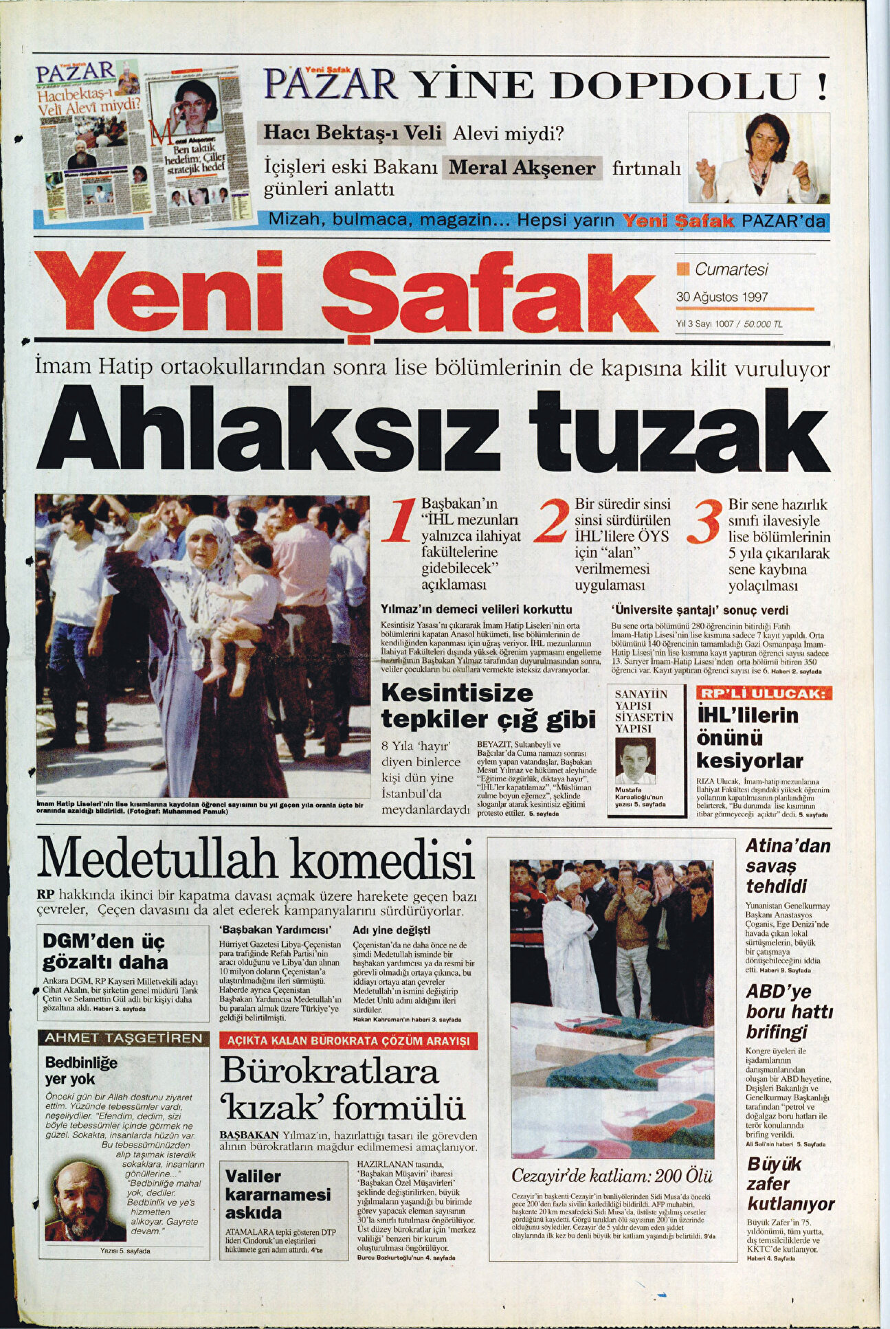 - İMAM HATİPLERE TUZAKMGK’nın katsayı kararı kamuoyunda büyük bir tepki doğurdu. İmam hatip lisesi mezunlarını üniversiteye sokmama girişimine Yeni Şafak, “Bu Kadarı Da Fazla” başlığıyla tepki gösterdi. MGK kararları doğrultusunda Milli Eğitim Bakanlığı’nın başlattığı 8 yıllık zorunlu eğitim uygulaması için çalışmalar hızlandırıldı. Uygulamanın yürürlüğe girmesi ile imam hatip, Anadolu ve meslek liselerinde okuyan 540 bin öğrenci mağdur durumda kaldı.