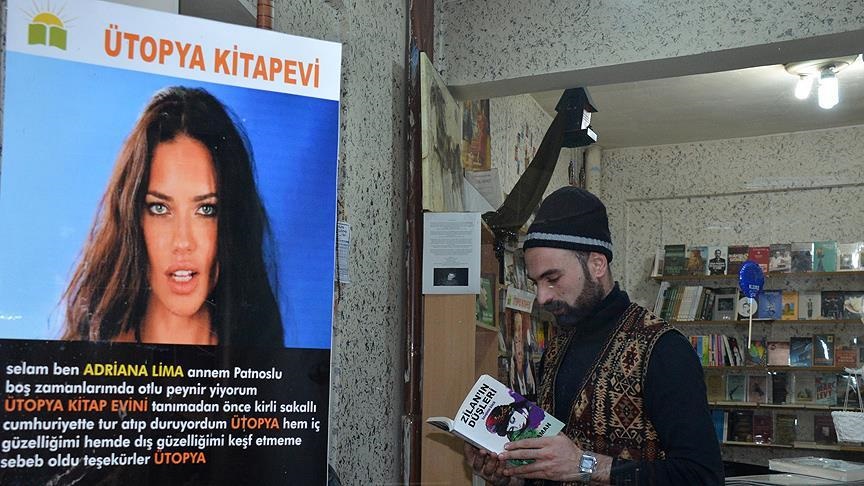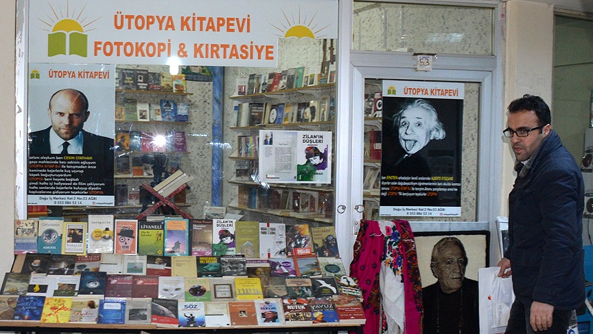 Ağrı'da kitapçılık yapan Serhat Kaya, dünyaca ünlü isimlerin resimlerinin yer aldığı mizahi afişler hazırlayıp iş yerine asarak satışları ikiye katladı.