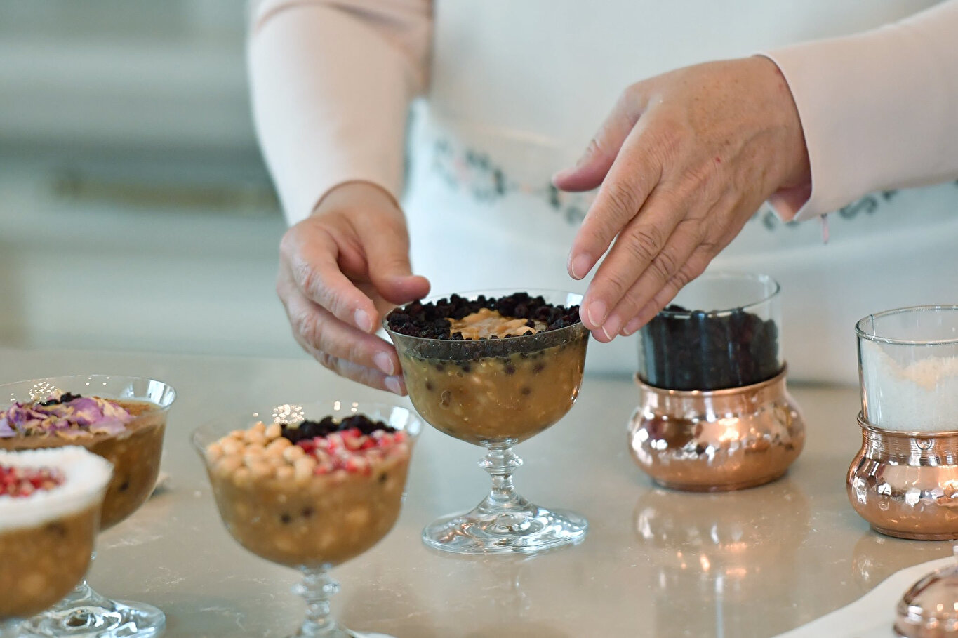 Aşurede şeker kullanmadığını belirten Emine Erdoğan, "Yurdumuzun dört bir yanından sofralarımıza ulaşan yerel ürünlerle hazırladığım aşurede şeker kullanmadık. Onun yerine kuru meyveler ve biraz da üzüm pekmeziyle tatlandırdık. Bu lezzetli, sağlıklı tarifin, sofralarınıza neşe getirmesini diliyorum." dedi.