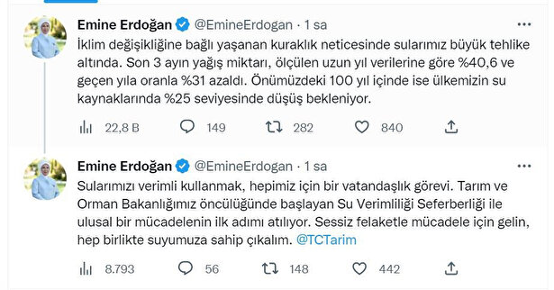 Emine Erdoğan, Twitter hesabından yaptığı açıklamada, iklim değişikliğine bağlı yaşanan kuraklık neticesinde sularımızın büyük tehlike altında olduğunu belirtti.