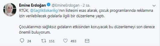 Cumhurbaşkanı Recep Tayyip Erdoğan'ın eşi Emine Erdoğan, çocuk programlarındaki gıda reklamlarına getirilen sınırlamayla ilgili, "Çocuklarımızı sağlıksız gıdaların etkisinden koruyacak bu düzenlemeyi son derece önemli buluyorum" ifadesini kullandı.