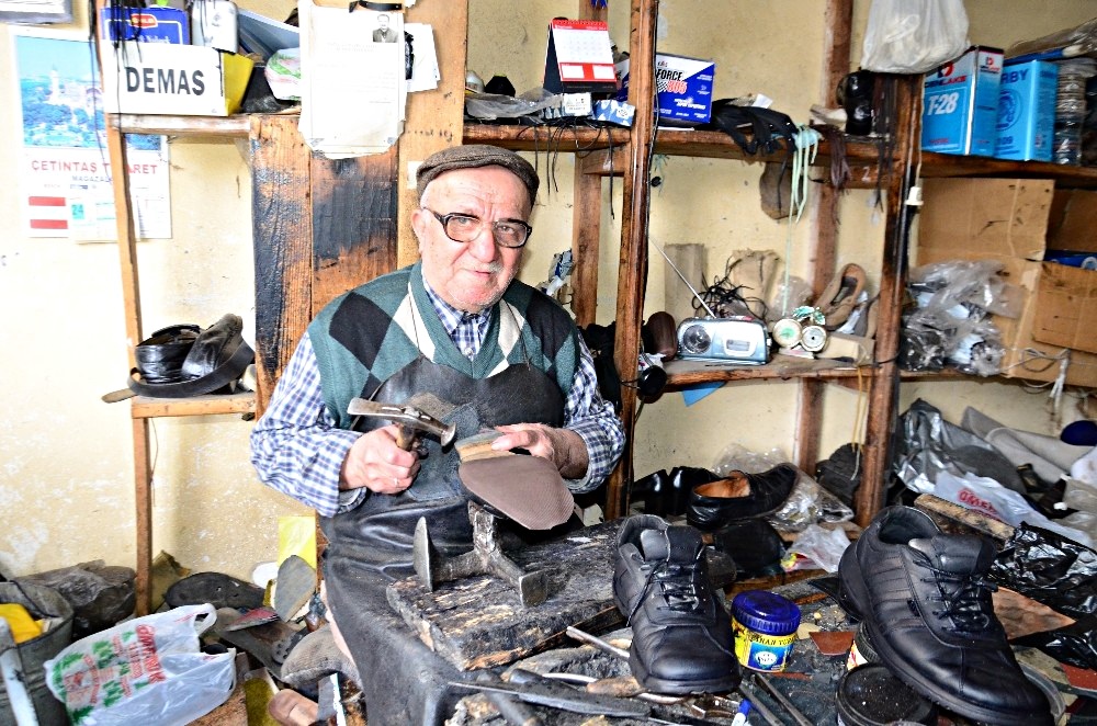 - İlçede ayakkabı tamirciliğine başladığında İstanbul’dan 3 bin liraya eski bir makine aldığını anlatan Doğanay, bu eski makineyi 72 yıl kullandığını belirtti.