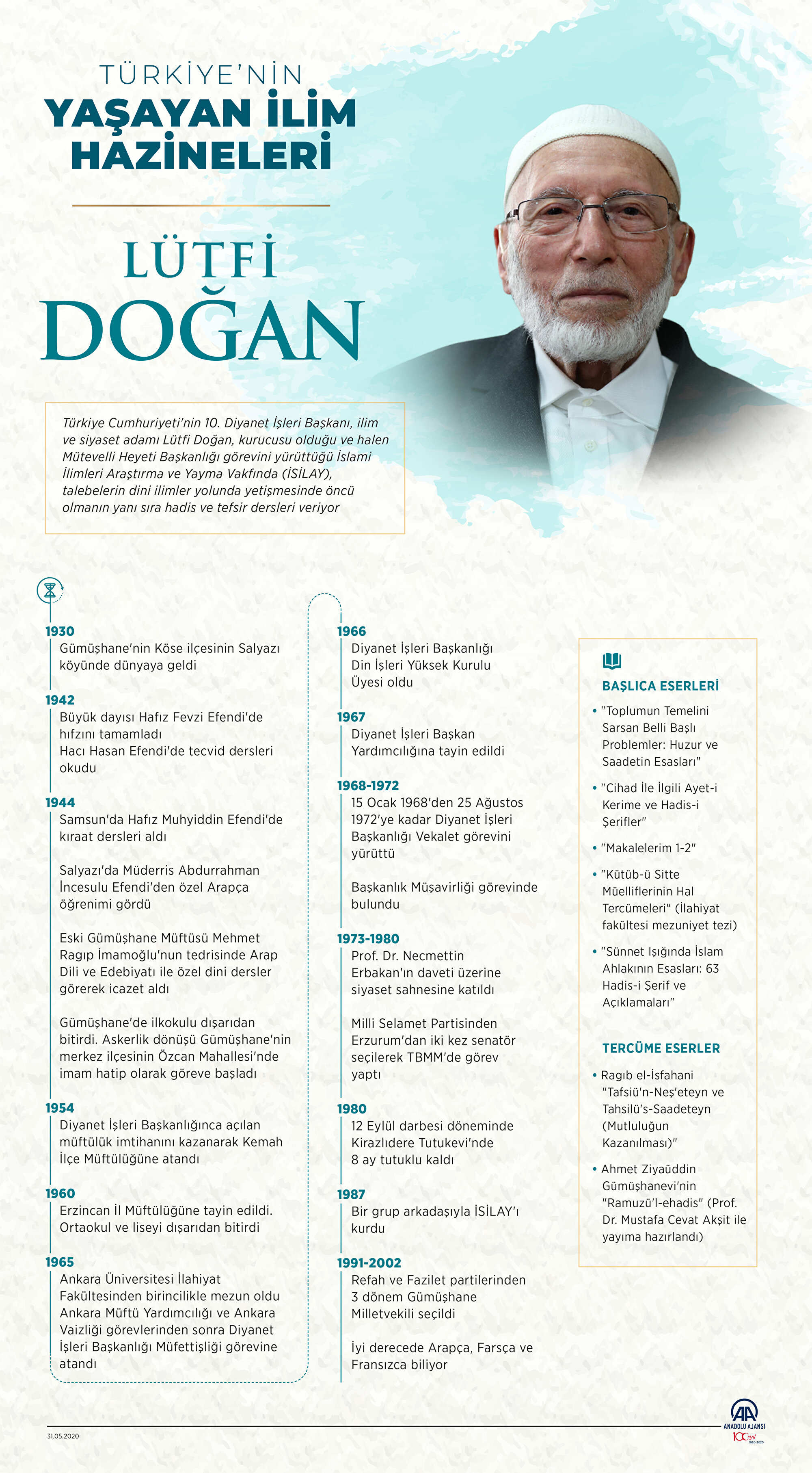 - Bir kısım arkadaşıyla 1987'de İSİLAY'ı kuran Doğan, Arapça, Farsça ve Fransızca biliyor. Mütevelli Heyeti Başkanı olduğu vakfın Keçiören ve Balgat'taki müesseselerinde, ilerleyen yaşına rağmen eğitim faaliyetlerine devam eden 90 yaşındaki Doğan, "Türkiye'nin Yaşayan İlim Hazineleri" haber dosyası kapsamında hayat hikayesi, ilmi çalışmaları, siyasi hayatında tanık olduğu önemli olaylar, İslam dünyasında son dönemde varlık gösteren "şiddet" ve "terör" eğilimli akımlarla ilgili değerlendirmelerde bulundu.