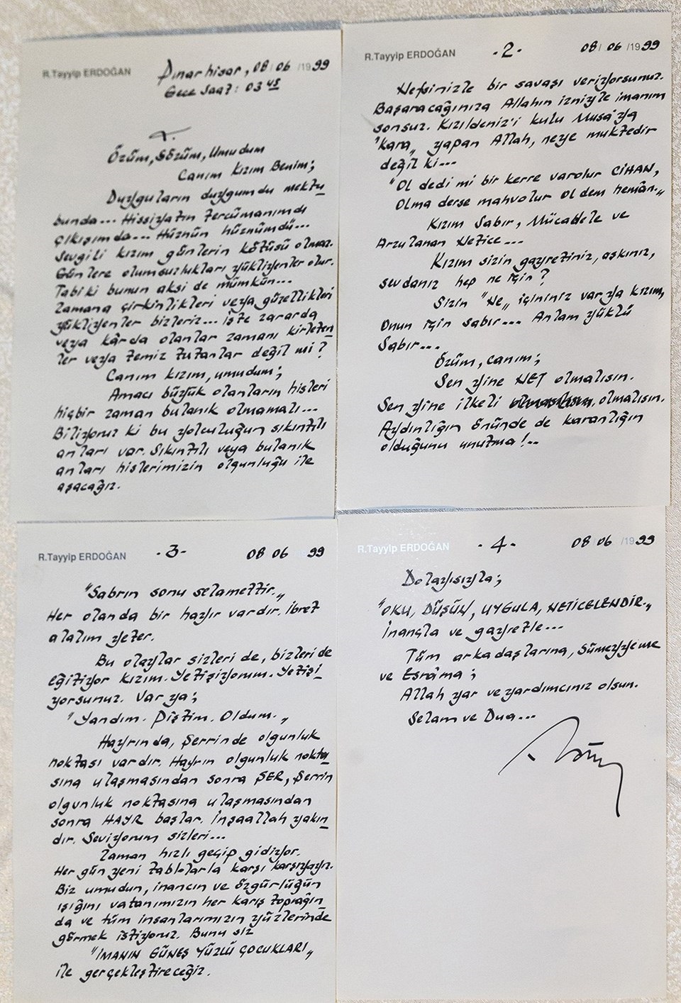 - "Özüm, sözüm, umudum, canım kızım benim. Duyguların duygumdur. Hissiyatın tercümanımdır çıkışımda, hüznün hüznümdür. Sevgili kızım, günlerin kötüsü olmaz, günlere olumsuzlukları yükleyenler olur, tabii ki bunun aksi de mümkün. Zamana çirkinlikleri veya güzellikleri yükleyenler bizleriz. İşte zararda veya karda olanlar, zamanı kirletenler veya temiz tutanlar değil mi?