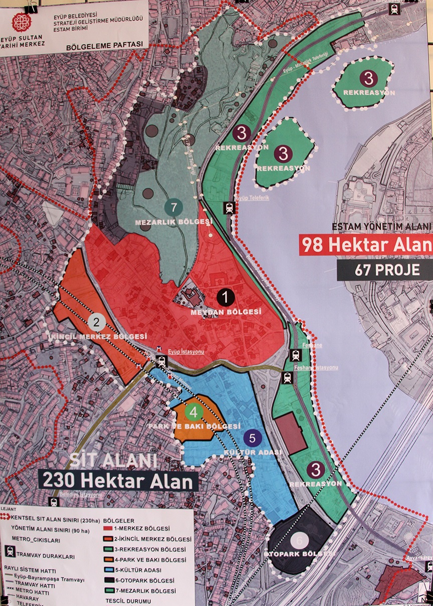 ESTAM'ın hazırladığı 67 projeyle Haliç'in kıyısında bulunan 98 hektarlık bölgede başta Eyüp Sultan Türbesi ve çevresi olma üzere, medrese, aşhane, kütüphane, imaret, hamam, mezarlıklar, hazireler ve diğer tüm yapılar asıllarına uygun şekilde restore edilmeye başlandı.
