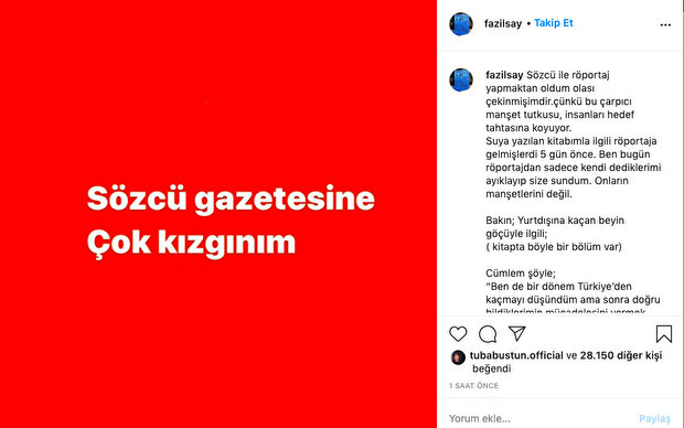 Sosyal medya hesabından paylaşım yapan Fazıl Say, verdiği röportajın sadece bir bölümünü keserek manşete taşıyan Sözcü gazetesini sert sözlerle eleştirdi.