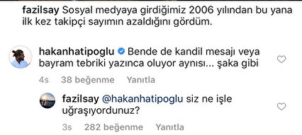 Piyanist Fazıl Say, Instagram sayfasındaki takipçilerinin azaldığını, bunun da paylaştığı sanat eseri fotoğraflarından kaynaklı olduğunu söyledi. Var Mısın Yok Musun ve Survivior yarışmalarıyla tanınan Hakan Hatipoğlu, Fazıl Say'ın paylaşımın altına "Bende de kandil veya bayram tebriği yazınca oluyor aynısı. Şaka gibi" yazdı. Fazıl Say ise o yoruma şöyle cevap verdi:
