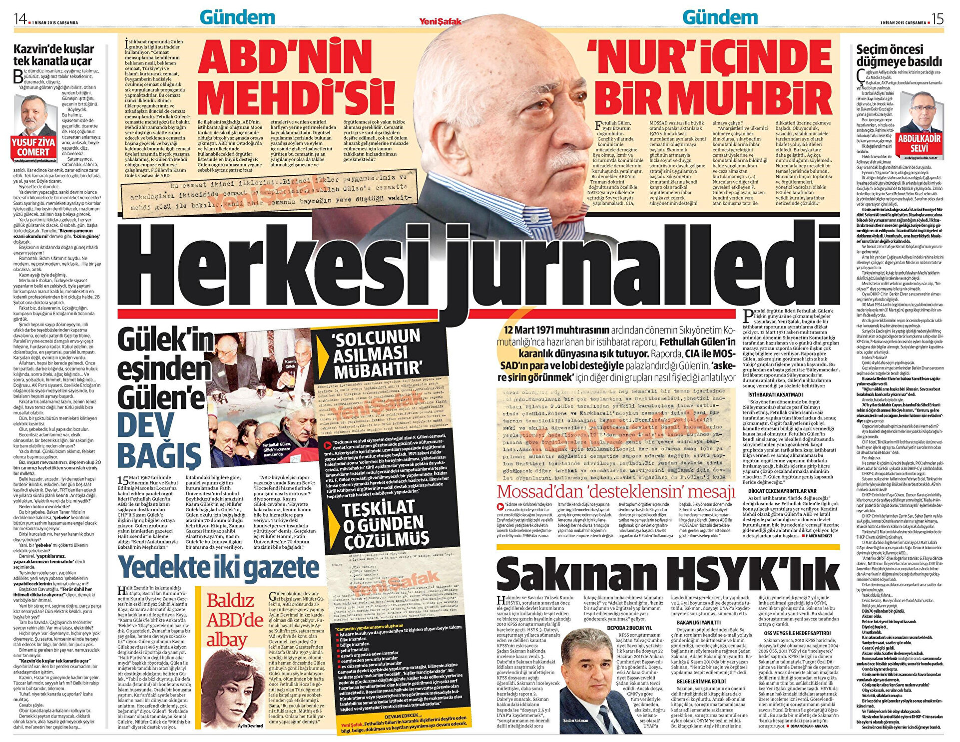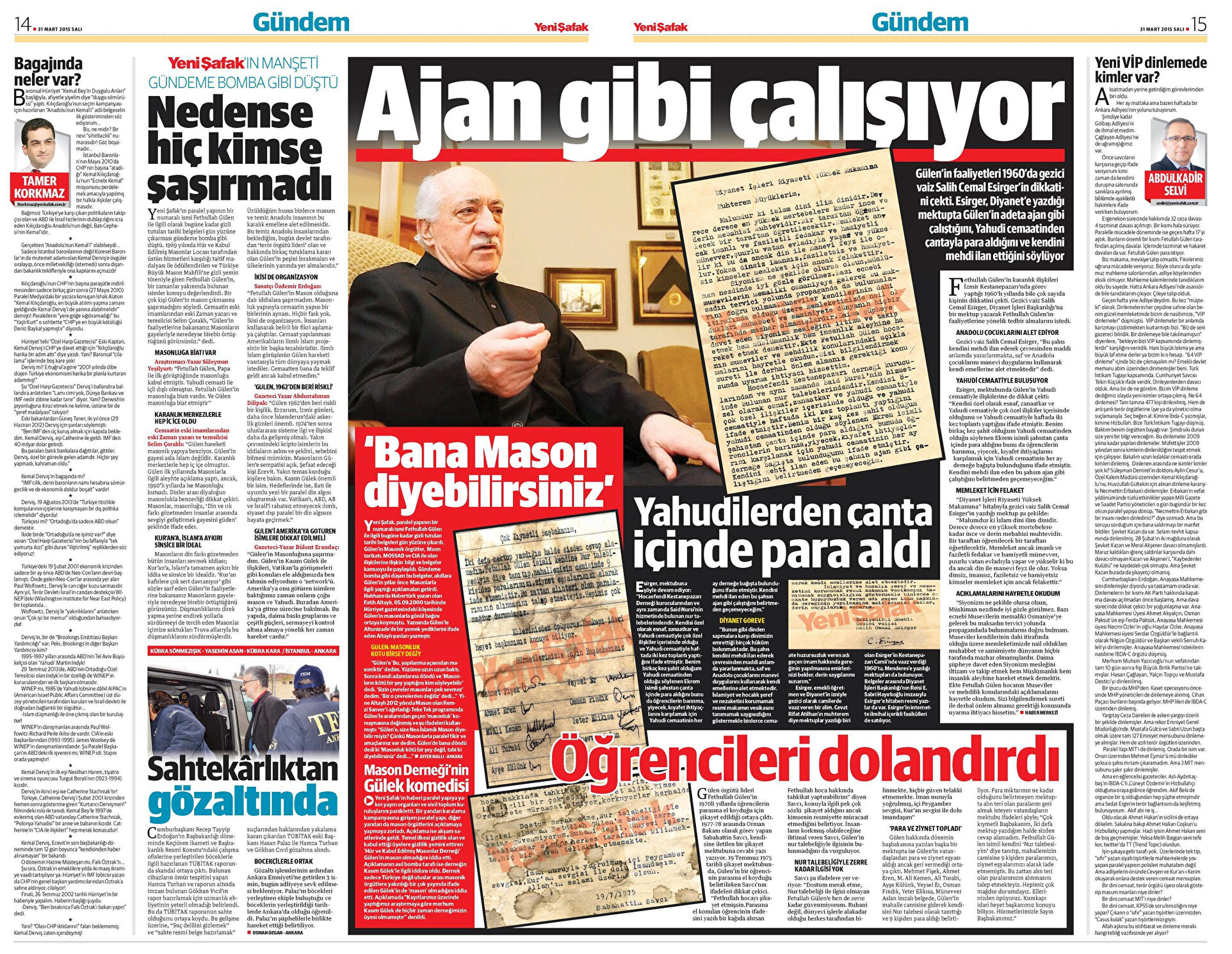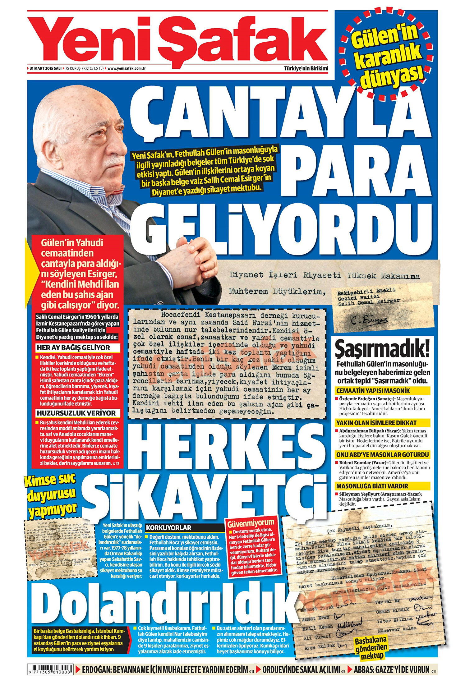 Gülen’in ilişkilerini ortaya koyan Yeni Şafak, 31 Mart 2015 günkü manşetinde vaiz Salih Cemal Esirger’in Diyanet’e yazdığı mektubuna yer verdi. Gülen’in Yahudi cemaatinden çantayla para aldığını söyleyen Esirger, “Kendini Mehdi ilan eden bu şahıs ajan gibi çalışıyor” diyor.