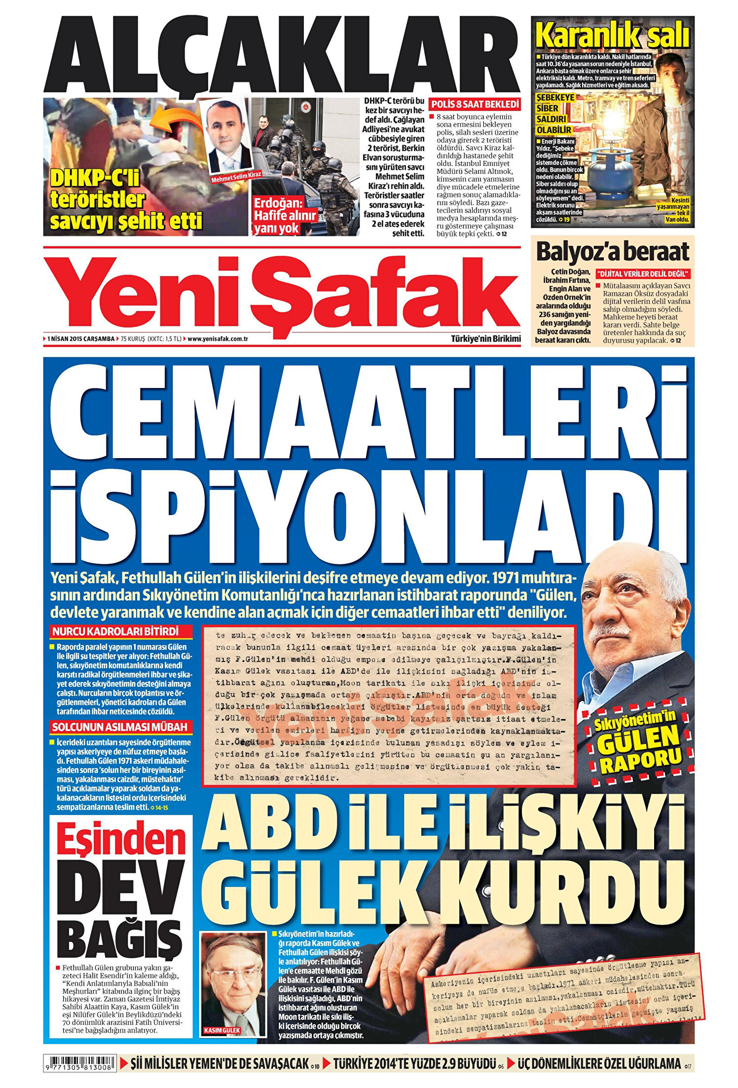 Yeni Şafak, 1 Nisan 2015’te ise Gülen’in diğer cemaatleri nasıl ispiyonladığını manşetine taşıdı. 1971 muhtırasının ardından Sıkıyönetim Komutanlığı’nca hazırlanan istihbarat raporunda, “Gülen, devlete yaranmak ve kendine alan açmak için diğer cemaatleri ihbar etti” deniliyor. Raporda Gülen ile ilgili şu tespitler yer alıyor: Fethullah Gülen, sıkıyönetim komutanlıklarına kendi karşıtı radikal örgütlenmeleri ihbar ve şikâyet ederek sıkıyönetimin desteğini almaya çalıştı. Nurcuların birçok toplantısı ve örgütlenmeleri, yönetici kadroları da Gülen tarafından ihbar neticesinde çözüldü.
