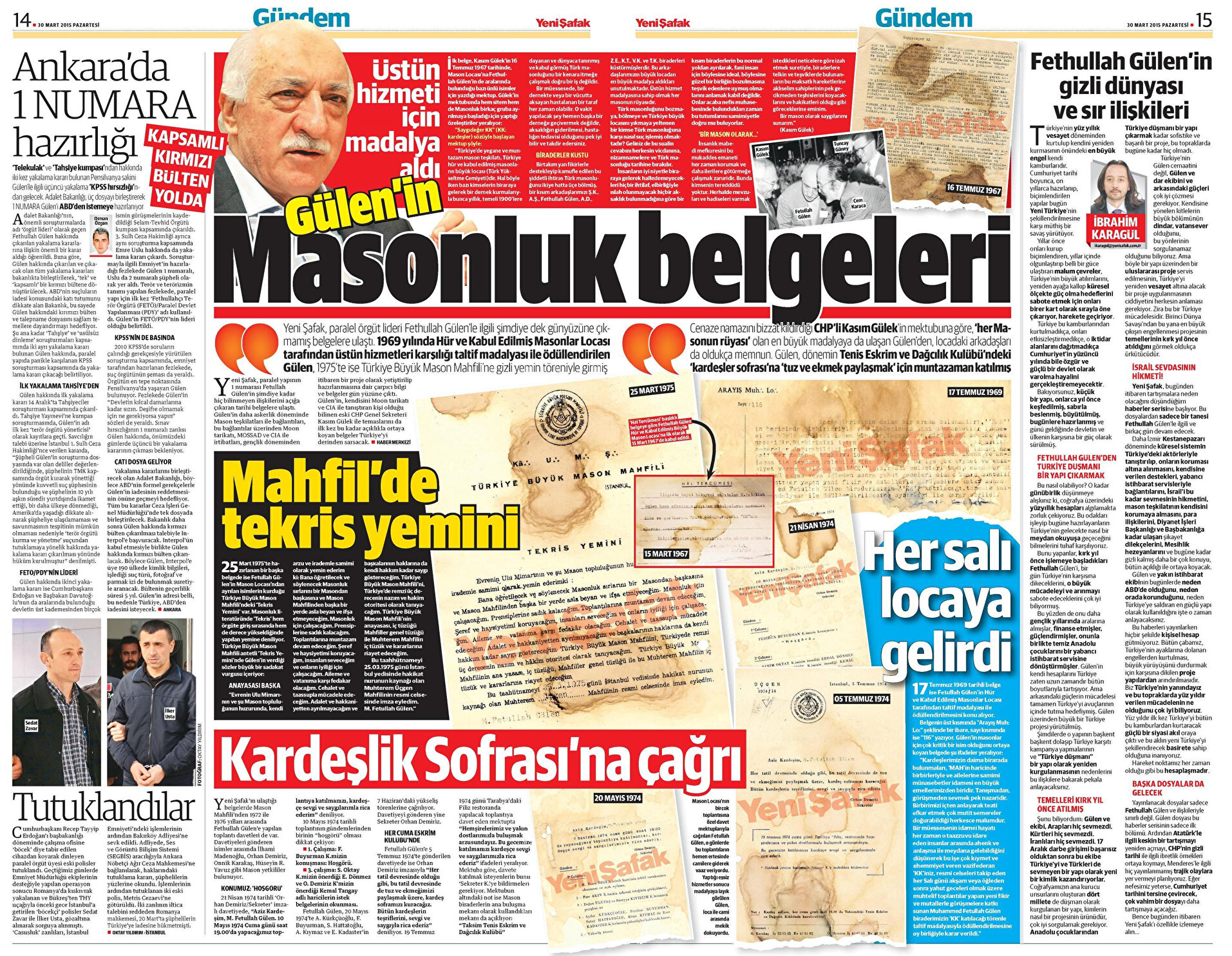Yeni Şafak, 30 Mart 2015 tarihinde manşetten verdiği belgeleri şu ifadelerle duyurdu: Paralel yapının 1 numarası Fetullah Gülen’in şimdiye kadar hiç bilinmeyen ilişkileri açığa çıktı. Yeni Şafak’ın ulaştığı tarihi belgelere göre Gülen ilk gençlik yıllarında Masonluk yemini etti ve üstün hizmetlerinden dolayı taltif madalyası aldı.