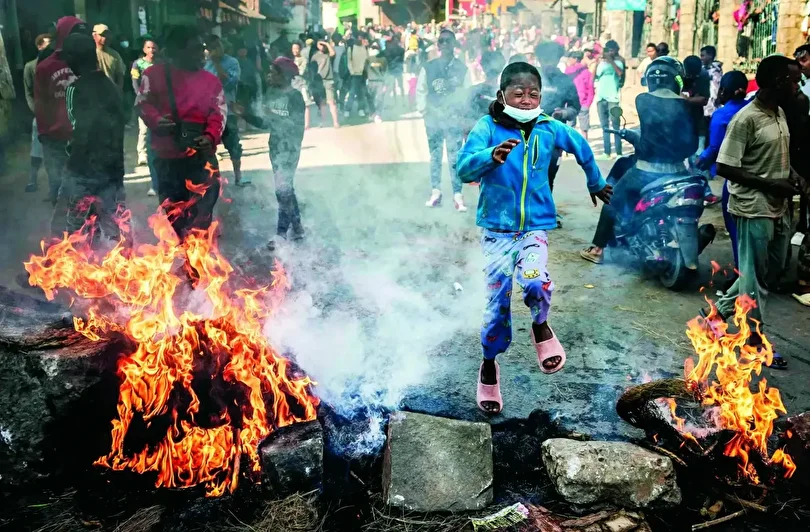 Madagaskar Antananarivo’da, gençlerin öncülüğünde 12 gündür devam eden gösterilerde bir çocuk, protestocular ile güvenlik güçleri arasındaki çatışmada alevler içindeki barikatın üzerinden atlıyor. Günlerdir devam eden protestolar, sadece elektrik ve su kesintilerine karşı değil; aynı zamanda adalet ve değişim talebiyle dolu bir ateşle dans.