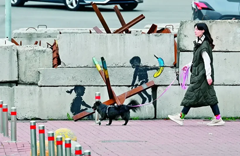 Rusya’nın işgali altında zor günler geçiren Ukrayna’nın başkenti Kiev’de, Bağımsızlık Meydanı’nda İngiliz sokaka sanatçısı Banksy’nin sokak sanatı duvar resmi önünden köpeğiyle yürüyen bir kadın… Savaşın yıkıcı etkilerine rağmen hayat devam ediyor; sanat ise direnişin ve umudun sessiz dili olarak şehirde varlığını sürdürüyor.