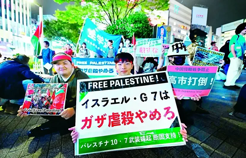 Japonya’nın Shinjuku bölgesinde öğrencilerden oluşan bir grup, 7 Ekim 2025’te düzenlenen gösteride “Gazze’de soykırım” karşısında ülkenin artan militarizasyonunu ve İsrail’in en büyük destekçisi ABD ile Japonya arasındaki askeri işbirliğini protesto ediyor. Barış ve adalet için yükselen bu genç ses, savaşın ve gerginliklerin gölgesinde nefes olmaya devam ediyor.