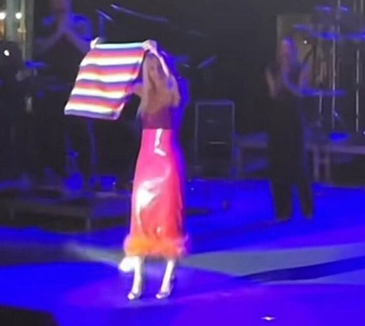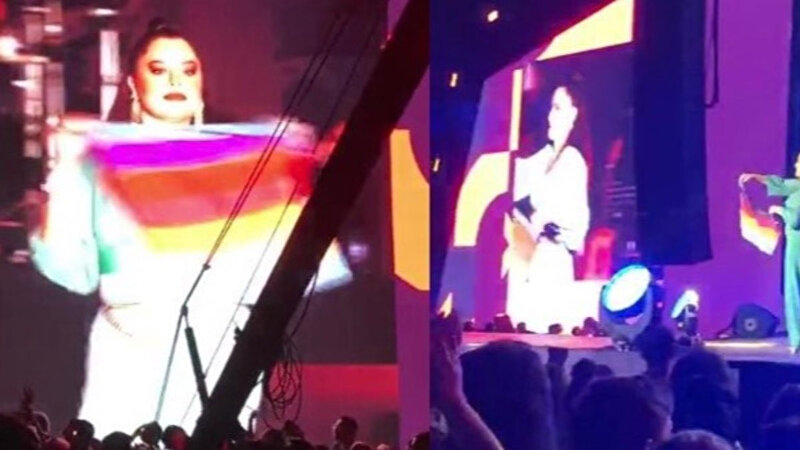 Ardından seyircilerin arasından sahneye LGBT bayrağı uzatılmasının üzerine, "Var vallahi var. Elden ele elden ele" diyen Karaca, bayrağı alarak sahnede salladı.