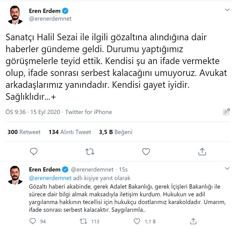 Erdem, sosyal medya hesabından yaptığı açıklamada, "Sanatçı Halil Sezai ile ilgili gözaltına alındığına dair haberler gündeme geldi. Durumu yaptığımız görüşmelerle teyid ettik. Kendisi şu an ifade vermekte olup, ifade sonrası serbest kalacağını umuyoruz. Avukat arkadaşlarımız yanındadır. Kendisi gayet iyidir. Sağlıklıdır... Gözaltı haberi akabinde, gerek Adalet Bakanlığı, gerek İçişleri Bakanlığı ile sürece dair bilgi almak maksadıyla iletişim kurdum. Hukukun ve adil yargılanma hakkının tecellisi için hukukçu dostlarımız karakoldadır. Umarım, ifade sonrası serbest kalacaktır. Saygılarımla.." ifadelerini kullanmıştı.