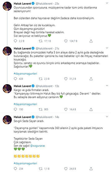 İhtiyaç sahipleri için kurucusu olduğu AHBAP yardım kuruluşu ile sürekli çalışan şarkıcı Haluk Levent, koronavirüs sonrası oluşan süreçte de oluşan mağduriyetleri gidermek için harekete geçti. Twitter hesabından yaptığı bir paylaşım ile sayısız ünlü ismi harekete geçiren Levent, adeta sosyal medyada seferberlik başlattı. #dayanışmagunleri kampanyası kısa sürede çığ gibi büyüdü.