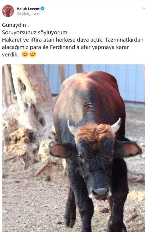 Oğluna pantolon alamadığı için intihar eden baba ile ilgili attığı tweetlerden dolayı linç edilen Haluk Levent, küfür ve hakaret edenlere dava açtıklarını ve alacakları tazminatla da, kurban bayramında denizden yüzerek kaçan ineği Ferdinand'a ahır yapacaklarını söyledi.