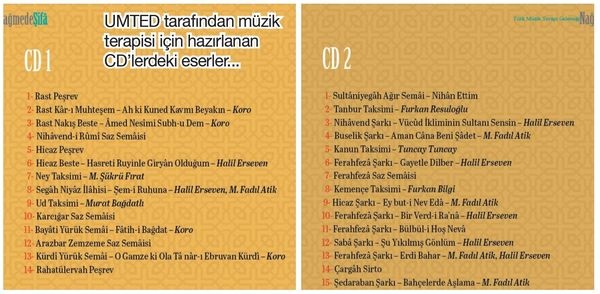 Hem müzikle tedaviyi hem de hastanelerde şiddeti azaltmayı amaçlayan proje kapsamında hazırlanan CD’lerde yer alan eserler arasında Rast Peşrev, Rast-ı Kar-ı Muhteşem, Nihavend-i Rumi Saz Semaisi de var.